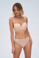 Geometryczna koronka w odcieniu świetlistego beżu, inspirowana miękkimi liniami piaszczystych wydm, subtelnie otula ciało i pozostaje niewidoczna pod ubraniem dzięki płaskiemu splotowi. Biżuteryjne detale w kolorze różowego złota dodają elegancji i podkreślają wyjątkowy charakter modelu.