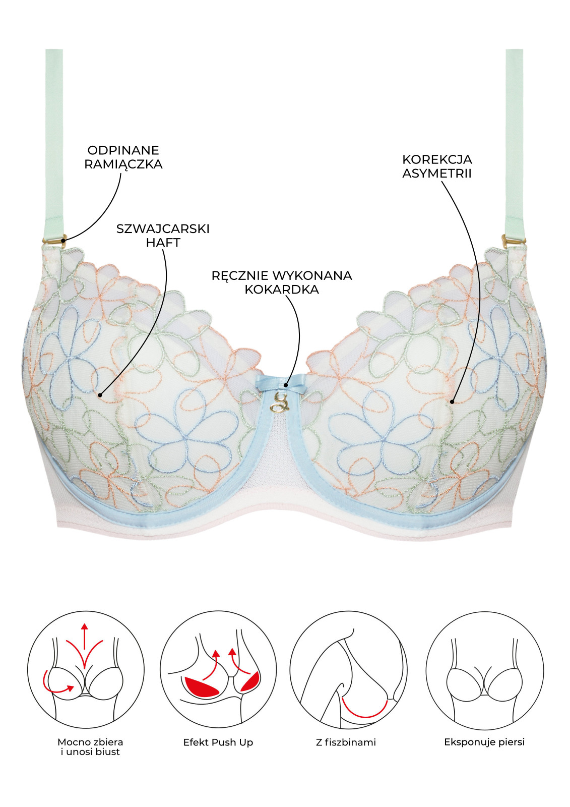 Biustonosz usztywniany z fiszbinami A337, stworzony z myślą o właścicielkach średnich i drobnych biustów. Dzięki swojej konstrukcji efektownie eksponuje piersi, unosząc je i optycznie powiększając, tworząc kobiecy, pełny dekolt. Idealny zarówno na co dzień, jak i na wyjątkowe okazje! Biustonosz powstał z zachwycającego, szwajcarskiego haftu w pastelowe stokrotki – ten uroczy motyw wspaniale podkreśla letnią opaleniznę i nadaje całości świeżości i lekkości.